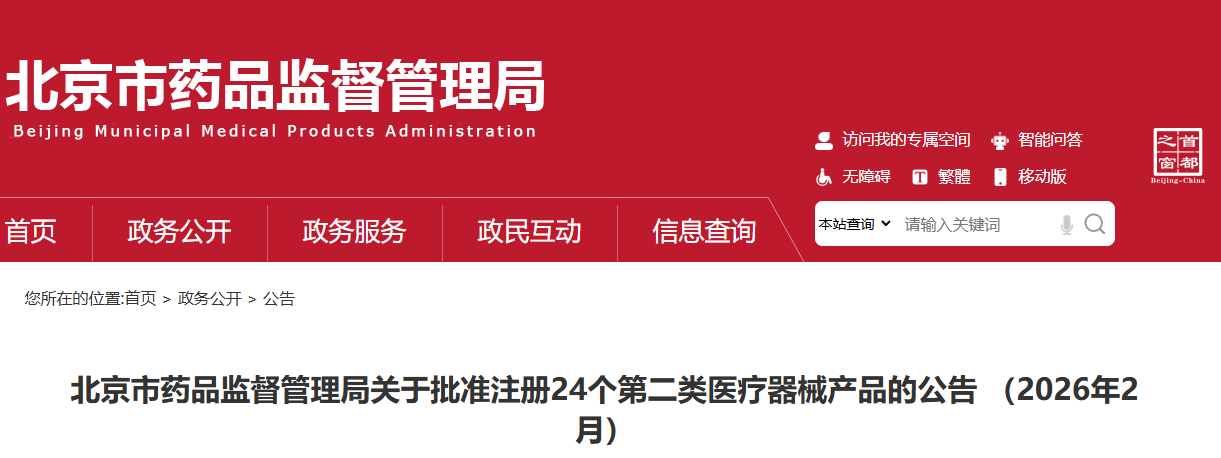 北京市26年2月份共批准注册第二类医疗器械产品24个(附名单)