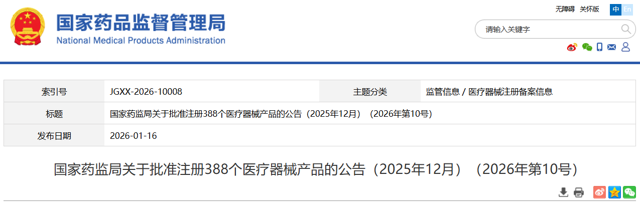 药监局25年12月共批准注册医疗器械产品388个(附名单)