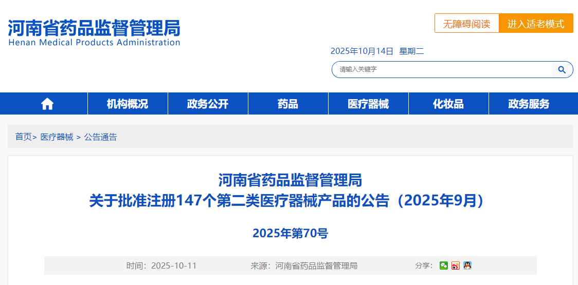 河南省25年9月份共批准注册第二类医疗器械产品147个(附名单)