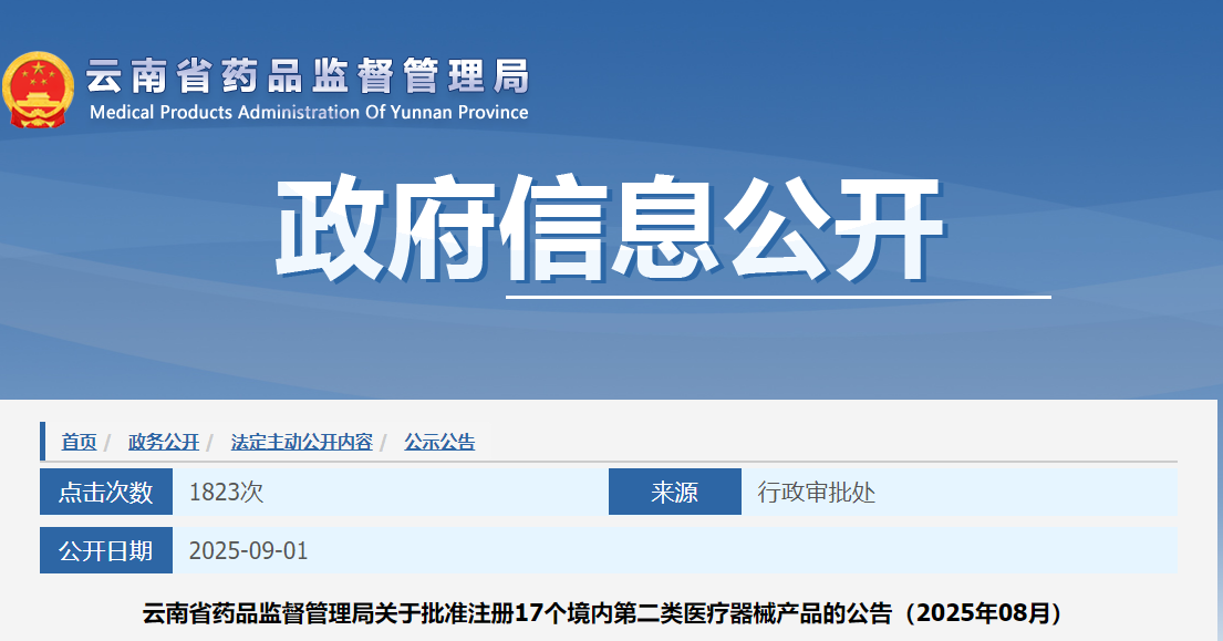 云南省25年8月共批准注册境内第二类医疗器械产品17个(附名单)