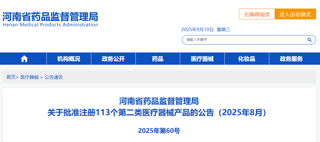 河南省25年8月共批准注册第二类医疗器械产品113个(附名单)
