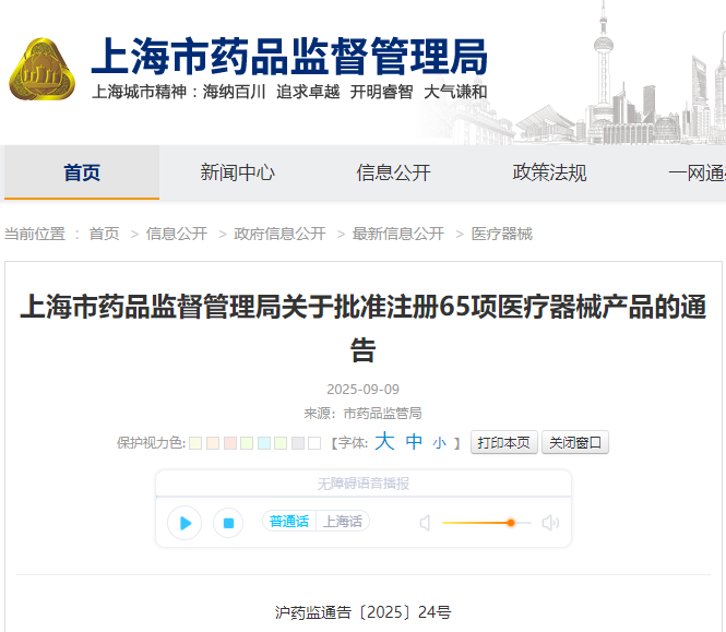 上海市25年8月共批准首次注册医疗器械产品65项(附名单)
