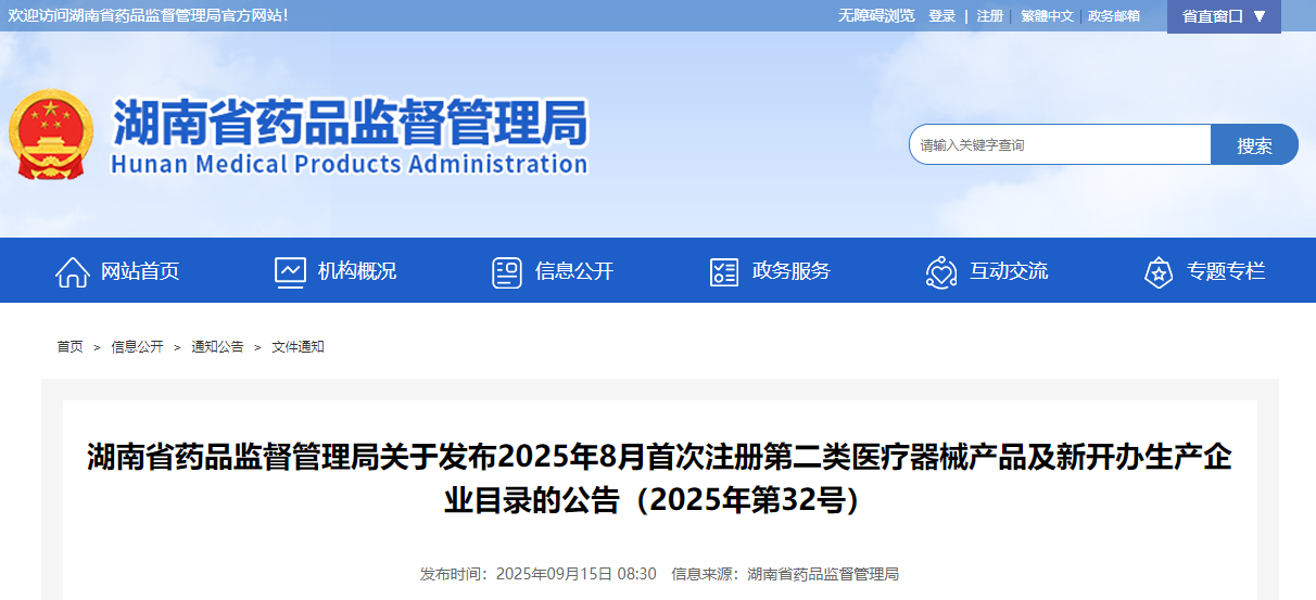 湖南省2025年8月首次注册第二类医疗器械产品及新开办生产企业目录明细公布!
