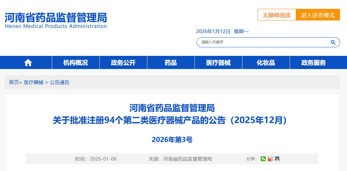 河南省25年12月份共批准注册第二类医疗器械产品94个(附名单)