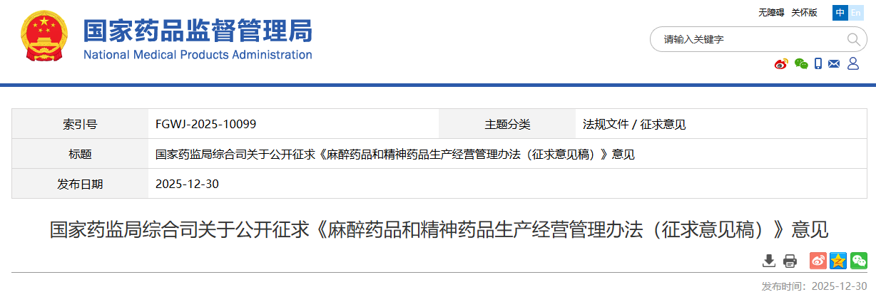 药监局发布《麻醉药品与精神药品生产经营管理措施(征求意见稿)》!