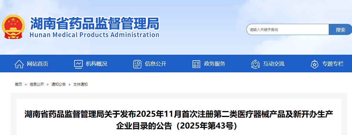 湖南省25年11月份共批准首次注册第二类医疗器械产品53个,新办生产企业14家(附名单)