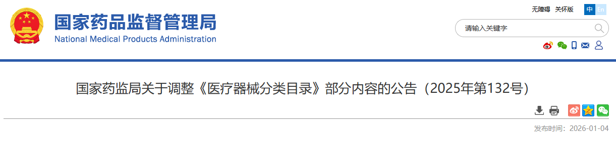 头条!国家药监局发布2025年最后一次调整《医疗器械分类目录》部分内容公告!