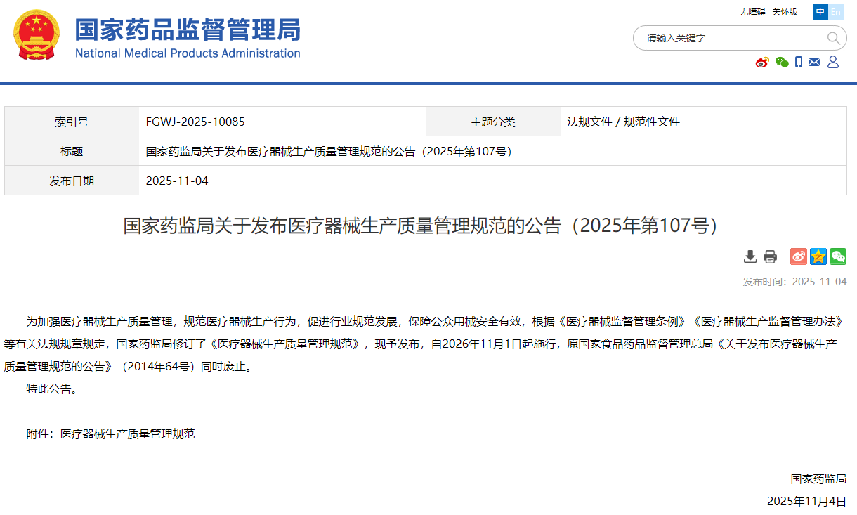 重磅!2026版《医疗器械生产质量管理规范》发布!26年1月1日起正式实施!