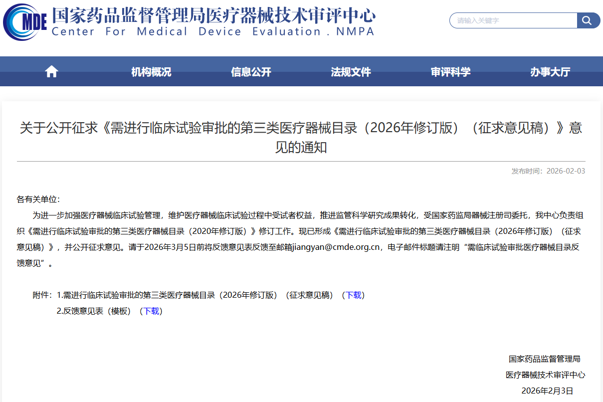 需开展临床试验审批的第三类医疗器械目录(2026年修订版)(征求意见稿)发布!