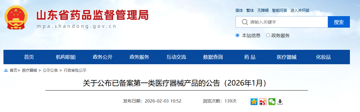 山东省26年1月各地市第一类医疗器械产品备案公告