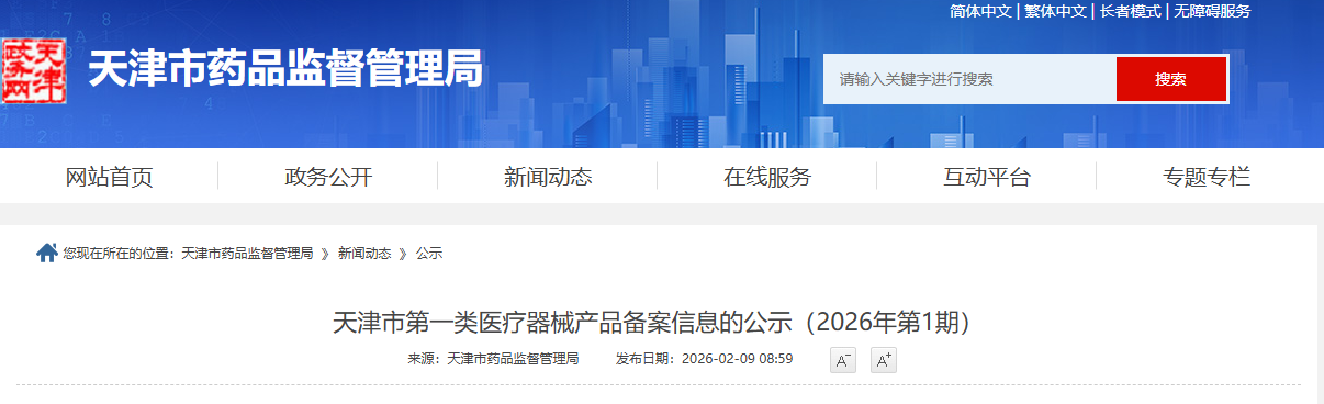 天津市26年1月第一类医疗器械产品备案信息公示!